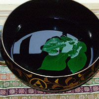 <耳香の遊び> 小箱の中に小豆を入れて耳元で数合わせをします。 香木の代わりに小豆を使い、鼻の代わりに耳を使います。 |