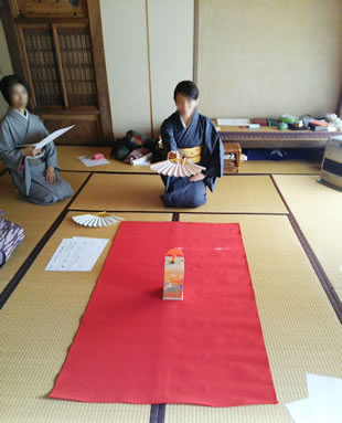 <投扇興> 毛氈の上に立てた的に扇を飛ばし、当たった形で点数を競うお座敷遊びです。 |